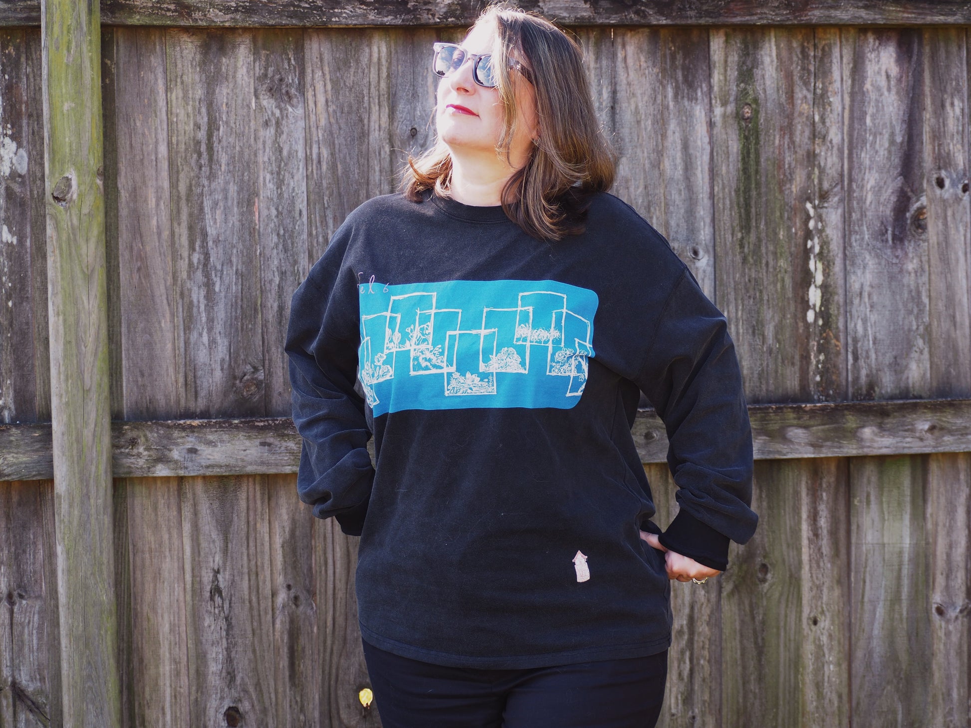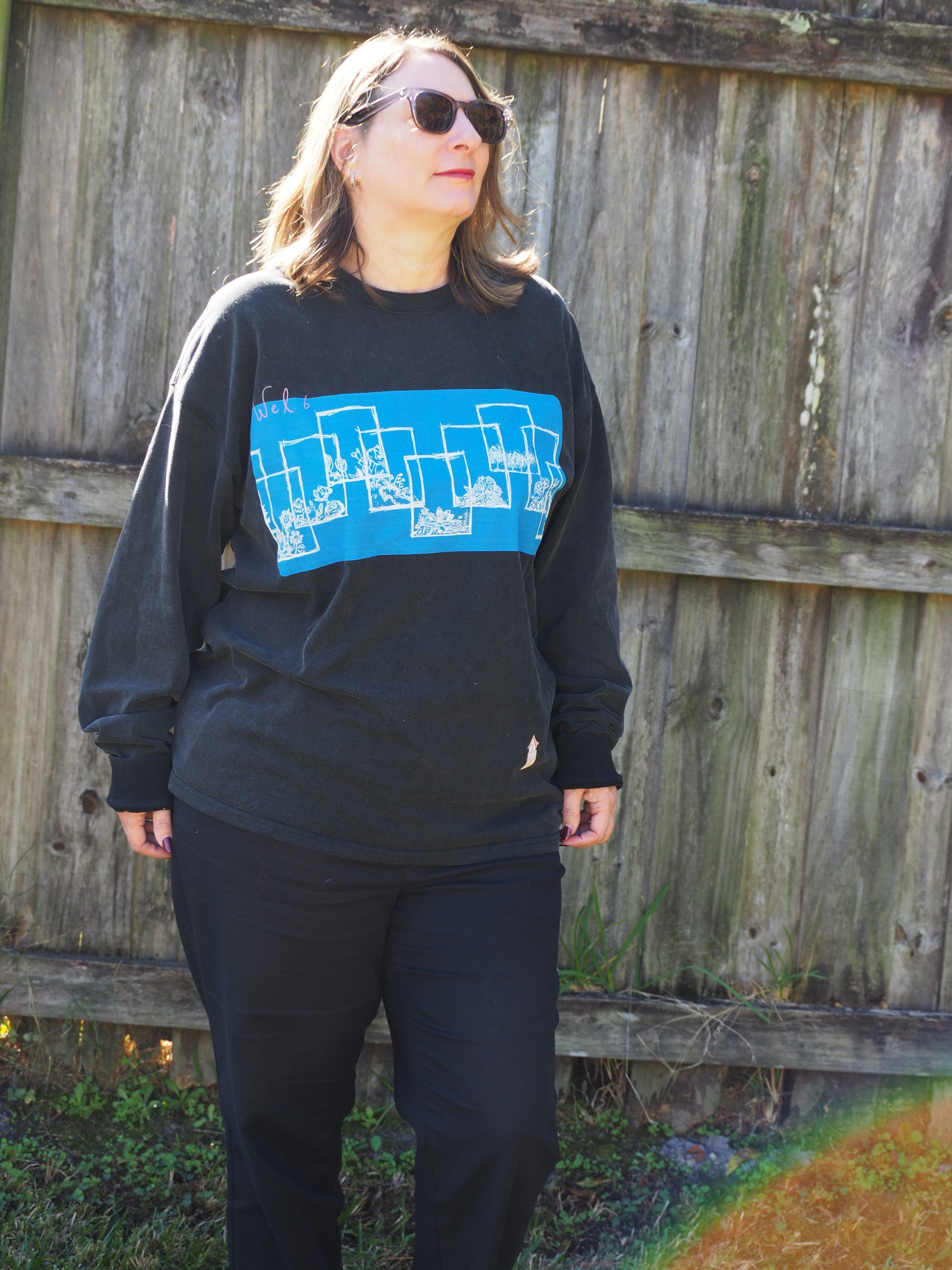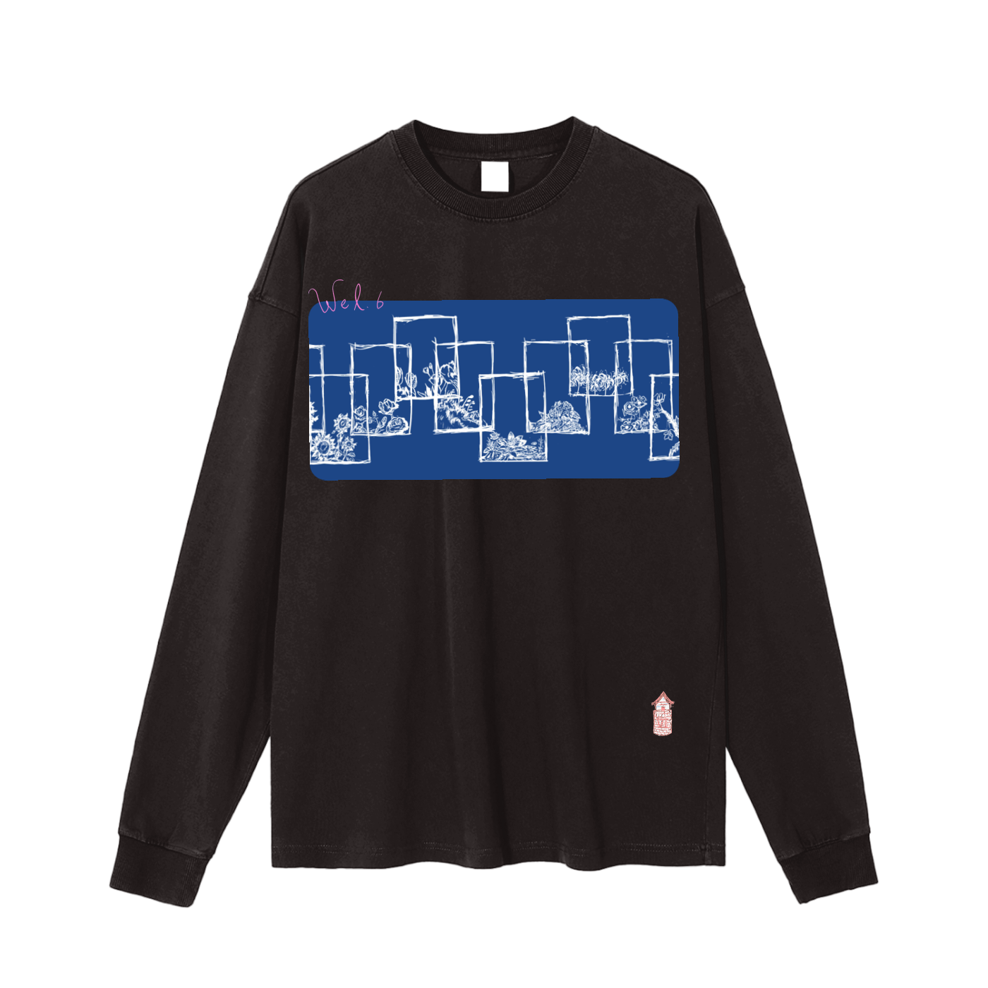 'No Empty Vase' is a long sleeve t-shirt with thicker material and a vintage finish. The design features a blue background with various flora drawn in several geometric boxes. The intricate detail beckons a few glances more. Additionally, the Wel6 logo is featured with one of its variants in pink at the bottom right.